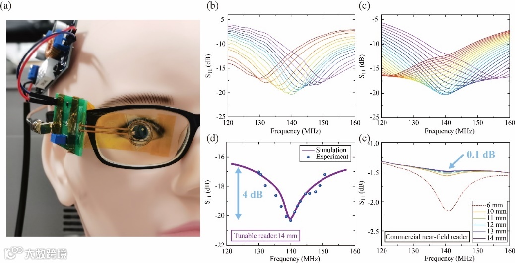 此外,团队成功地将阅读器和框架眼镜集成,在镜瞳距的远距离读取下提升了隐形眼镜无线阅读信号的信噪比,保证了系统整体的便携性。