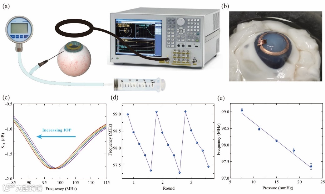 得益于优异的灵敏度、稳定性,和pHEMA水凝胶的柔性、亲水、高透氧,隐形眼镜在离体猪眼模型上成功实现无线眼压监测。眼压传感的灵敏度为1.101‰ mmHg-1,平均误差在0.30 mmHg,满足眼压检测的临床要求。