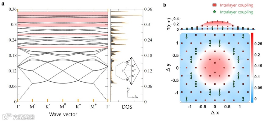 图2:a 最低28个光子能带的带状结构。与摩尔超晶格的弱耦合机制相反,高能模式(粉色区域)有很大的间隙开口。b 跳跃强度作为两个不同准原子之间沿x和y方向位移的函数。可以发现,层间耦合(红色)的强度比层内耦合(绿色)占优势。该结果直接验证了这里的光子晶体表现出摩尔超晶格的强耦合机制。
