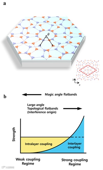 图1: a 光子摩尔超晶格的图片。两个蜂窝状的电介质共振器准原子(红色和蓝色)与扭转角度重叠在一起。b 摩尔超晶格的强耦合示意图。当层间耦合超过层内耦合时,可以发现大扭角处有拓扑平带。这一特征与弱耦合体系直接相反,在弱耦合体系中,平带只出现在魔角处。