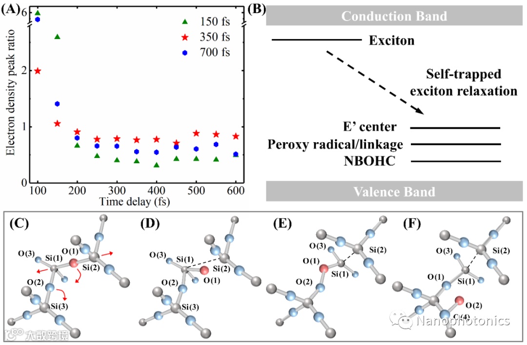 图4 不同脉冲延迟下电子密度演化分布;激子、自陷激子与缺陷的能级分布;未被激发、激发自陷激子、缺陷态下熔融石英分子结构