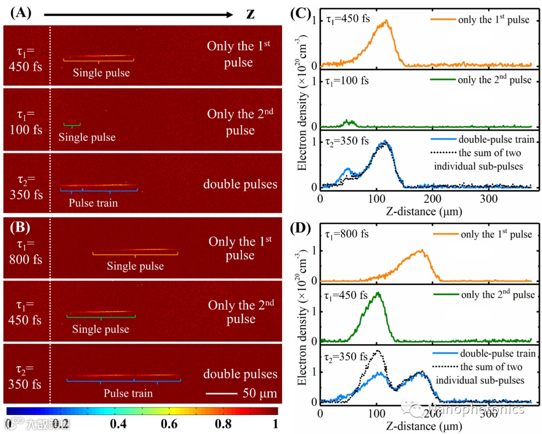 那么为何双脉冲飞秒激光会对全息图成像质量有如此大的提升效果?研究者利用飞秒激光泵浦探测技术进行了进一步的观测与解释。首先对350 fs双脉冲延时下的加工动态演化与仅单脉冲加工情况进行了对比(见图3),通过对激光激发材料瞬态透射率与电子密度演化过程进行分析,揭示了双脉冲情况下前序脉冲激发种子电子对材料加工的影响。