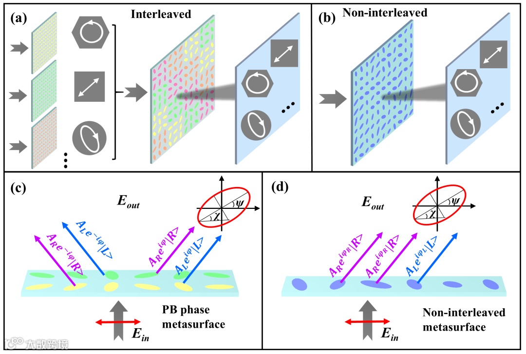 图1. 交错与非交错超构表面实现全偏振态波前调控的设计原理对比图。