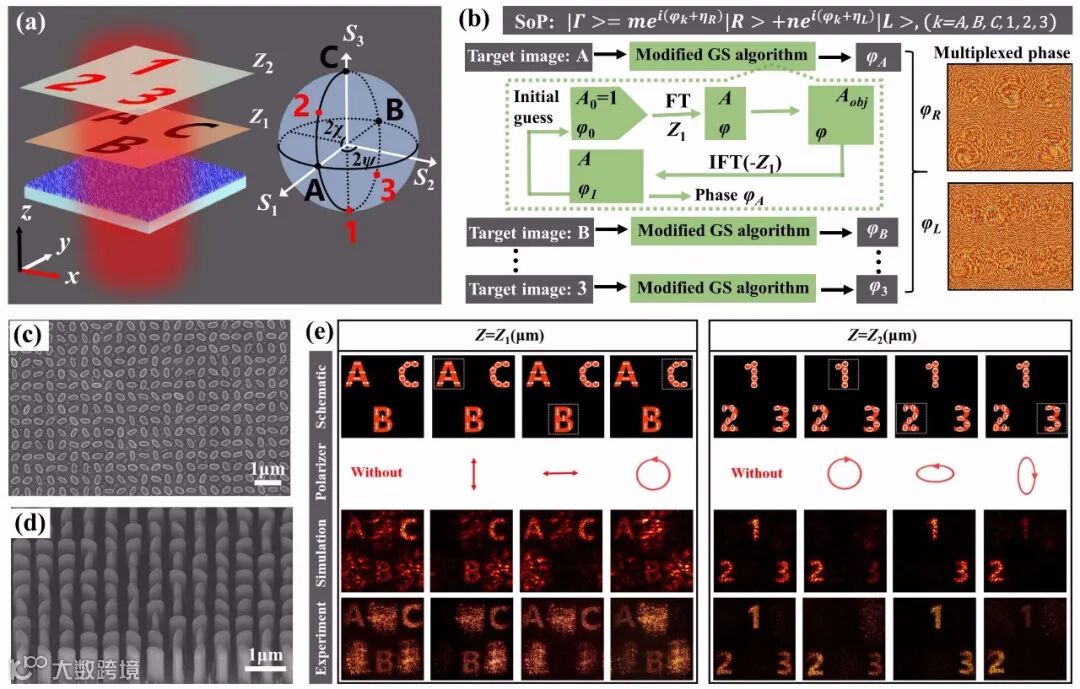 基于上述原理,研究团队在理论和实验上展示了具有6个独立偏振通道的三维矢量全息(如图3所示)。相比于二维矢量全息,本研究中拓展的空间维度—z轴上不同的距离,为提高信息容量和安全性提供了一个新的自由度。基于此,研究团队展示了一个双重光学加密的平台,首先通过给定的密钥重构出特定z轴距离上的全息图像,并将其作为第二次解密的密钥。然后利用这些密钥提取另一个特定z轴距离的矢量图像,最终获得所传输的信息。