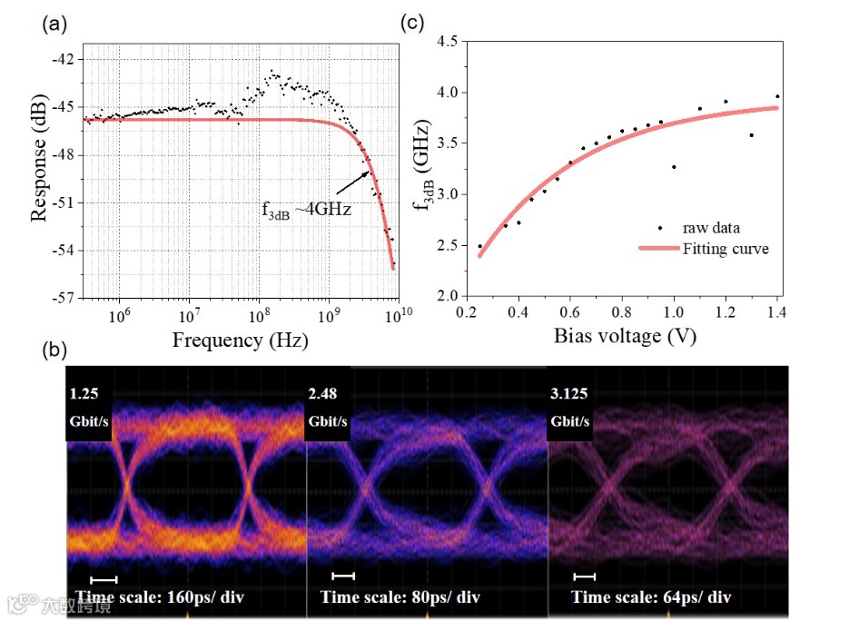 图3 (a) 波导集成 Te 光电探测器的频率响应。b) 偏置1.5V、垂直比2mV/div、伪随机二进制序列(PRBS)长度223-1 时测得的眼图。c) 不同偏置电压下的 f3dB。
