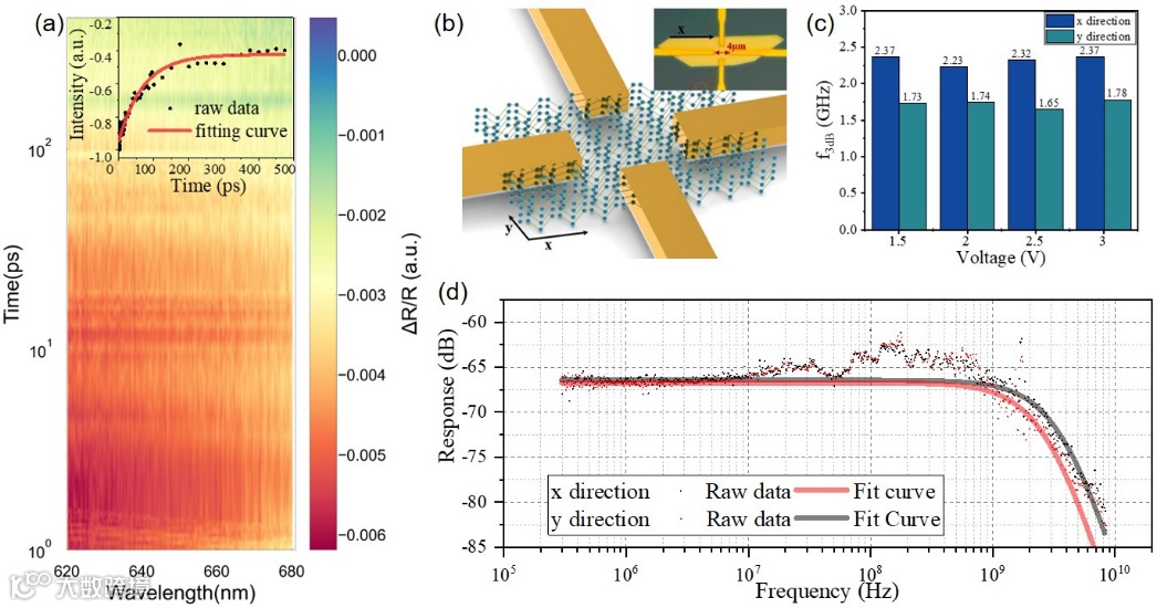 图1. (a) Te的瞬态反射光谱。插图:平均归一化载流子浓度曲线。(b) Te自由空间光电晶体管的示意图,方向x为[0001]晶向,y方向与x正交。(c) 器件沿 x 和 y 方向在不同偏置电压下的3dB带宽(f3dB)。(d) 器件在x和y方向上的3V偏置下的频率响应。
