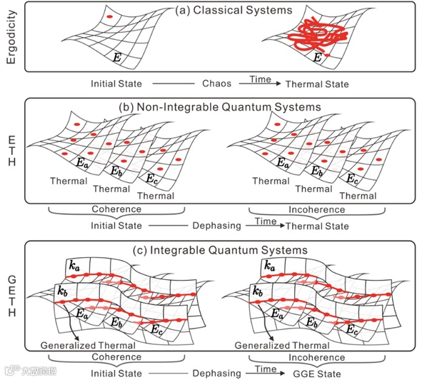 图1. 热化和广义热化机制。(a) 遍历性(Ergodicity)。(b) 本征态热化假说(ETH)。(c)广义本征态热化假说(GETH)。