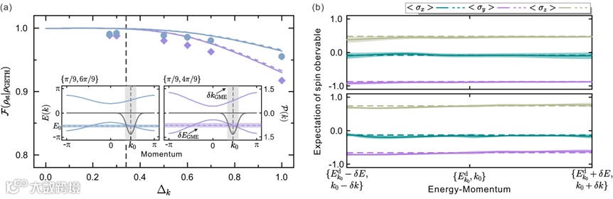 李传锋、许小冶课题组通过调控量子行走中的每一步的自旋控制参数,从而利用系统自身的动力学演化过程来实现这种特殊的系统初始化任务,并同时观察了不同初态下系统长时间的相干动力学演化过程。他们发现对于任一初态,自旋子系统弛豫后的稳态总是可以通过对角系综来预测,实验结果如图3所示。但是当初态动量空间半高宽足够小时(如图4a所示),自旋子系统弛豫后的稳态可以用广义微正则系综来表征。因此与初始叠加态的具体形式无关,而只与系统的守恒量有关。这一结果直接证明了GETH的有效性。GETH要求在具有相似守恒量值的共同本征态之间,其局域可观测的期望值几乎没有起伏。他们进一步通过前期发展的本征矢量重构技术,实验观测到在小的能量-动量窗口内本征矢量的三个泡利算符的期望值几乎是一个常数,满足GETH的要求。实验结果如图4b所示。