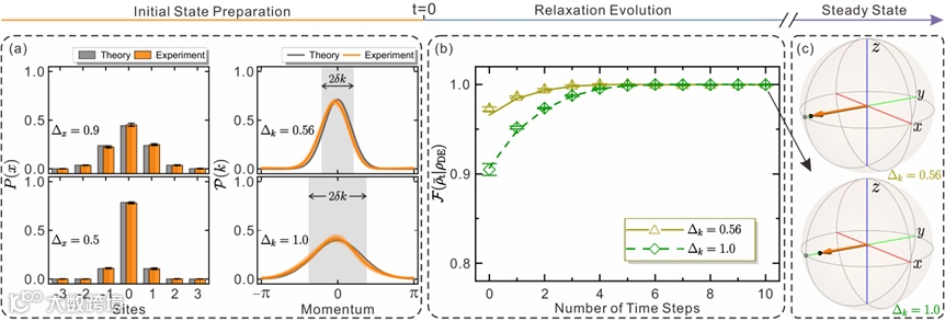 图3. 实验观测自旋子系统的平衡。(a) 位置和动量空间下的初态概率分布。(b) 自旋子系统的弛豫过程。(c) 自旋态的布洛赫(Bloch)球表示。