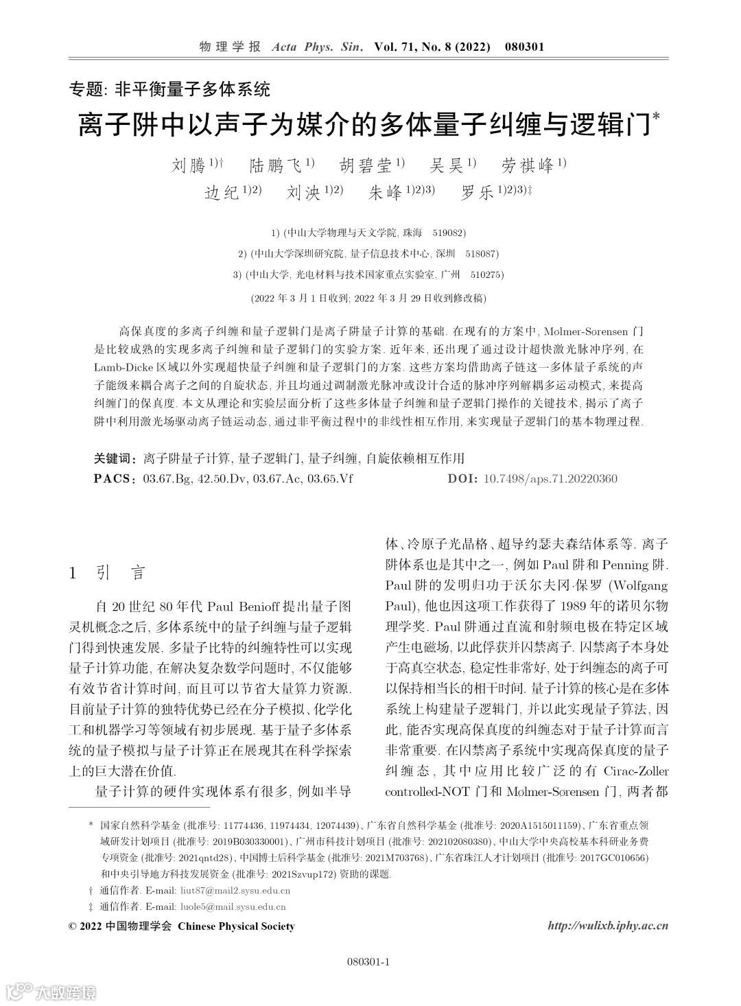 启科量子首席科学家、中山大学罗乐教授带领的研究团队在《物理学报》2022年第71卷第8期发表了《离子阱中以声子为媒介的多体量子纠缠与逻辑门》一文。文章分析了离子阱中以声子为媒介的多体量子纠缠和量子逻辑门的关键技术,揭示了利用激光场驱动离子链运动态,通过非线性相互作用,来实现囚禁离子量子逻辑门的基本物理过程。