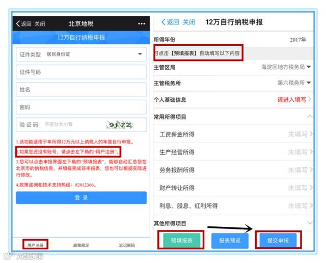 纳税人可以在上述方式中任选其一进行申报,点击申报界面的“预填报表”按钮,将自动汇总本人在北京市的纳税信息并预填生成申报表,确认提交后即可完成年所得12万自行纳税申报。