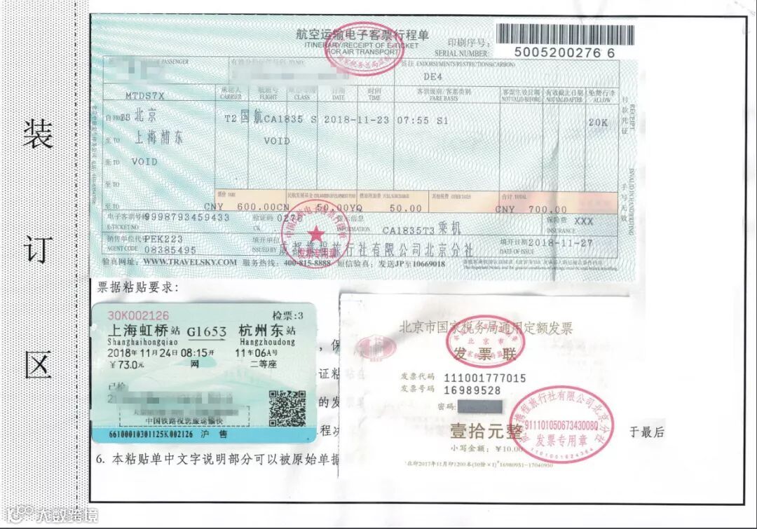 与A4纸大小相同的电子发票及附件(合同、会议通知等)无需粘贴,可直接附在报销单后。