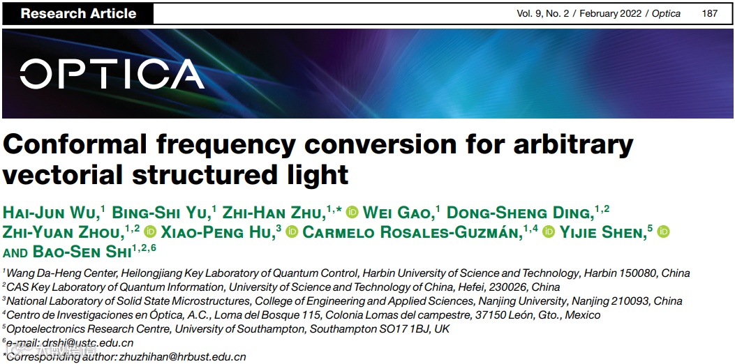 H. Wu, B. Yu, Z. Zhu, W. Gao,D. Ding, Z. Zhou, X. Hu, C. Rosales-Guzmán, Y. Shen, and B. Shi, "Conformalfrequency conversion for arbitrary vectorial structured light," Optica 9(2), 187-196(2022).