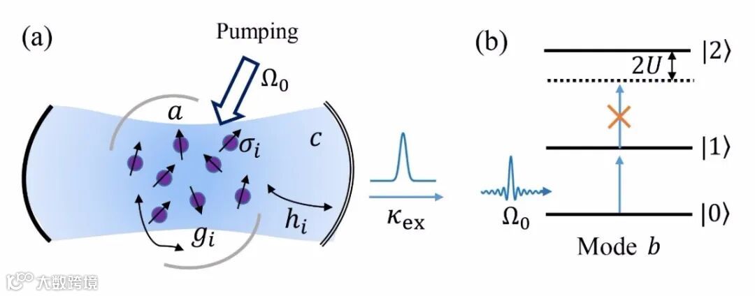 该项成果创新性地提出一种利用多个原子产生光子阻塞效应和单光子的理论方案。如图1所示,系统由两个光学腔和一团二能级原子耦合而成。其中灰色的腔为辅助腔,黑色的腔为收集腔。辅助腔与二能级原子的共振频率有一个大的失谐。这一大的失谐使得原子与原子通过辅助腔的中介形成了一个有效的偶极-偶极相互作用。此时,这一辅助腔-二能级原子系统可以等效看为单个具有非线性能级的“超级原子”。当用一束光激发这一超级原子基态时,由于光子阻塞效应,多光子态无法被激发,因此出射的光是单光子。收集腔的作用是保证单光子的收集效率和定向性。