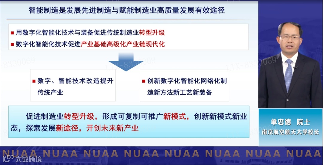 “绿色制造 智能制造 高质量发展”为本次论坛主题,中国工程院院士、南京航空航天大学校长单忠德作题为《数字化智能化制造技术与装备发展》的开场报告,表示智能制造是发展先进制造与赋能制造业高质量发展有效途径,助力建设制造强国。