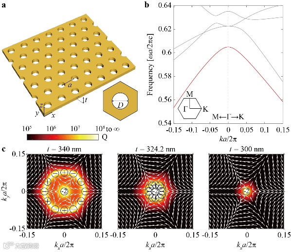 图1 (a)光子晶体平板结构示意图;(b)能带结构;(c)BIC的拓扑荷调控以及Q分布