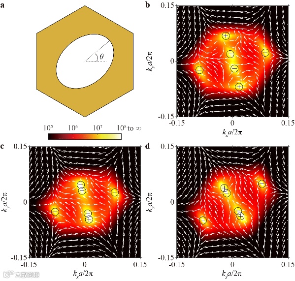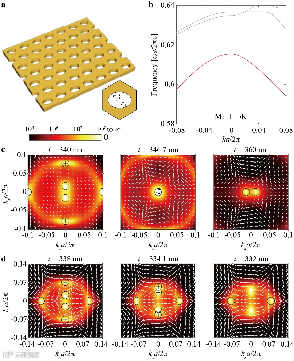 图3 (a)光子晶体平板原胞示意图;(b)BIC的拓扑荷调控以及Q分布;(c,d)merging BIC在动量空间中的调控