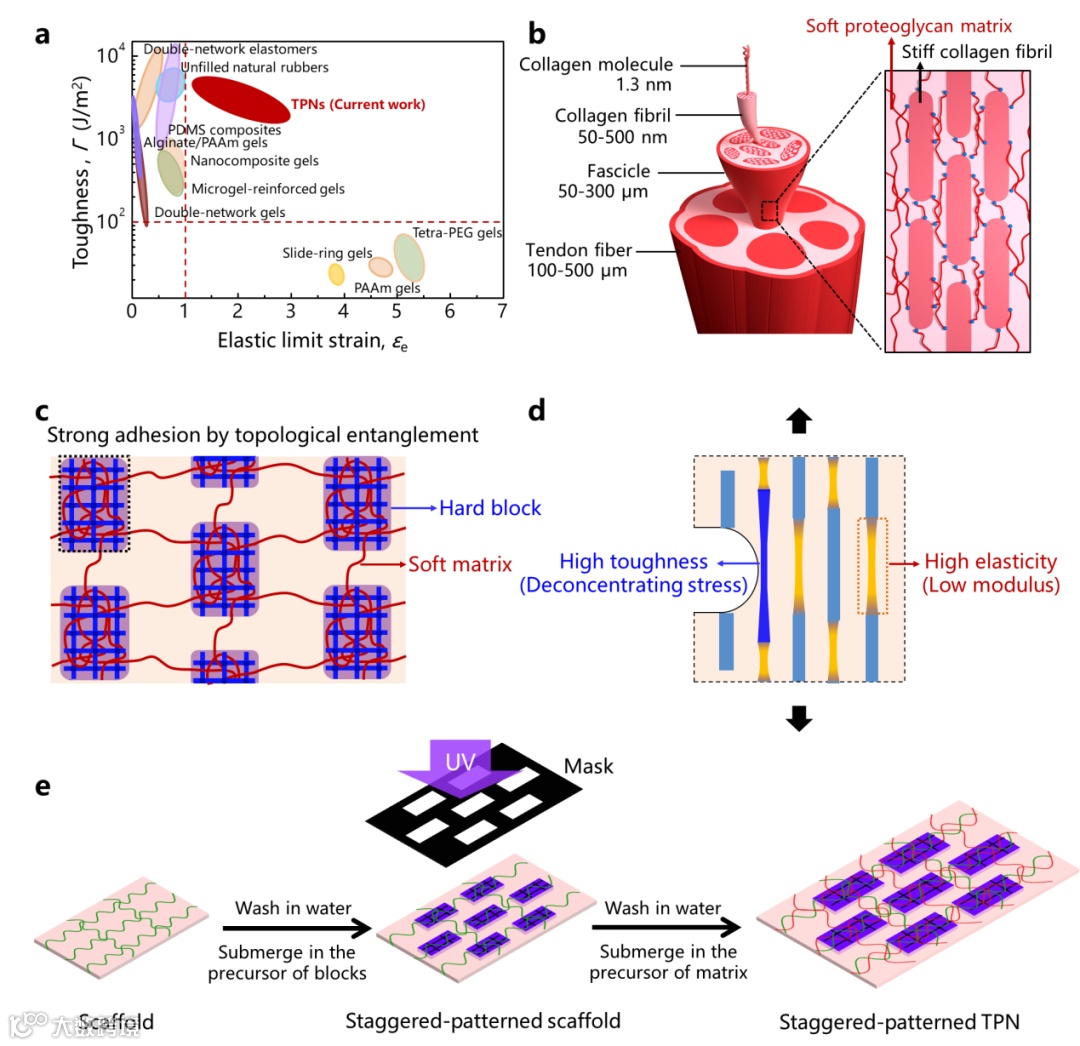 而反观自然界,天然的承载软组织—肌腱却拥有优异的弹韧性能,这与其特殊的微观结构密切相关。肌腱起着将肌肉产生的力传递到骨头并储存弹性能的作用。它们具有如图1b所示的复杂多级结构,肌腱纤维由大量平行的肌束所构成,而肌束又是由大量胶原原纤维(硬相)错列排布于蛋白多糖基质(软相)中复合而成。这种软硬相错列复合结构及其强粘接界面能有效缓解裂纹尖端的应力集中,从而大幅提高肌腱的韧性,与此同时,连续的软相能承担大部分的弹性变形。