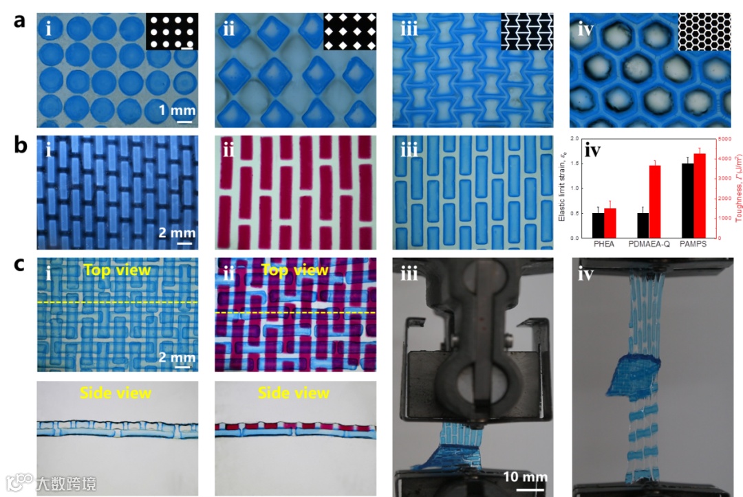 利用三步顺序聚合法和掩膜光刻技术制备TPN水凝胶(图1e)。在每个聚合物网络固化后,将样品浸泡在水中,以除去未反应的成分。在浸泡过程中,聚合物网络会发生溶胀,这是在设计制备工艺中必须考虑的因素。首先制备第一层低交联的网络,作为合成硬块的载体。浸泡后,将载体浸入第二层网络的前驱体溶液中,通过光刻技术聚合。浸泡后,第二层网络发生溶胀。载体承载着第二层网络的硬块,但由于其力学性能太弱,不能作为基质。通过将具有错列图案的载体浸入第三层网络的前驱体溶液中,固化和浸泡,合成第三层高分子网络。由于硬块的约束,第三层高分子网络适度溶胀。第一层和第三层网络是低交联的聚丙烯酰胺(PAAm),第二层网络是高交联的聚(2-丙烯酰胺-2-甲基丙磺酸)(PAMPS)。软相基质(软相)由两层互穿网络(PAAm/PAAm)组成,硬块(硬相)由三层互穿网络(PAAm/PAMPS/PAAm)组成,软相和硬相通过拓扑缠结形成强粘接界面。在第三层网络形成后,TPN水凝胶的力学性能大幅提高,为后续的力学研究奠定了良好的基础。
