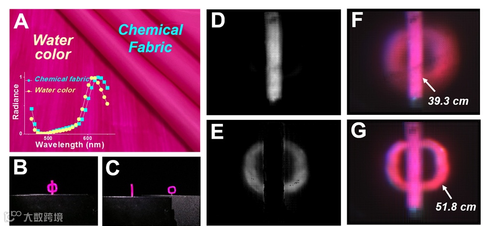 同色异谱现象是传统视觉检测、目标跟踪识别的盲点和难点。基于准确的深度和光谱信息提取,SLIM展示了超越传统成像系统的能力。两种同色材料,品红色化学织物布和水彩画纸,如图2A所示。在LED灯下这两种材质呈现同色异谱现象,简单来说就是颜色相同,而光谱分布略有不同。插图中绘制了它们的光谱曲线,可以看到,在可见光范围内这两种颜色显示出非常相似的光谱分布。当使用传统RGB相机拍照时,由于缺乏高分辨率的光谱信息与光场信息,只能捕获品红色“Φ”形图像(如正视图2B和侧视图2C所示)。只有同时获取光场和光谱信息才能完整揭示这两个物体之间的材质差异和位置关系,图2D显示了符合化纤光谱材质信息的全聚焦灰度图像,从中可以清楚地识别出化纤布。相同的也可以清楚地识别出水彩画的纸张(见图2E)。因此,SLIM的动态光谱成像能力可以更加有效和便捷的运用于材料识别和伪装鉴别;同时,SLIM的光场成像也具备先拍照后聚焦的能力,并可以获得物体的空间深度信息,如图2F,2G所示。