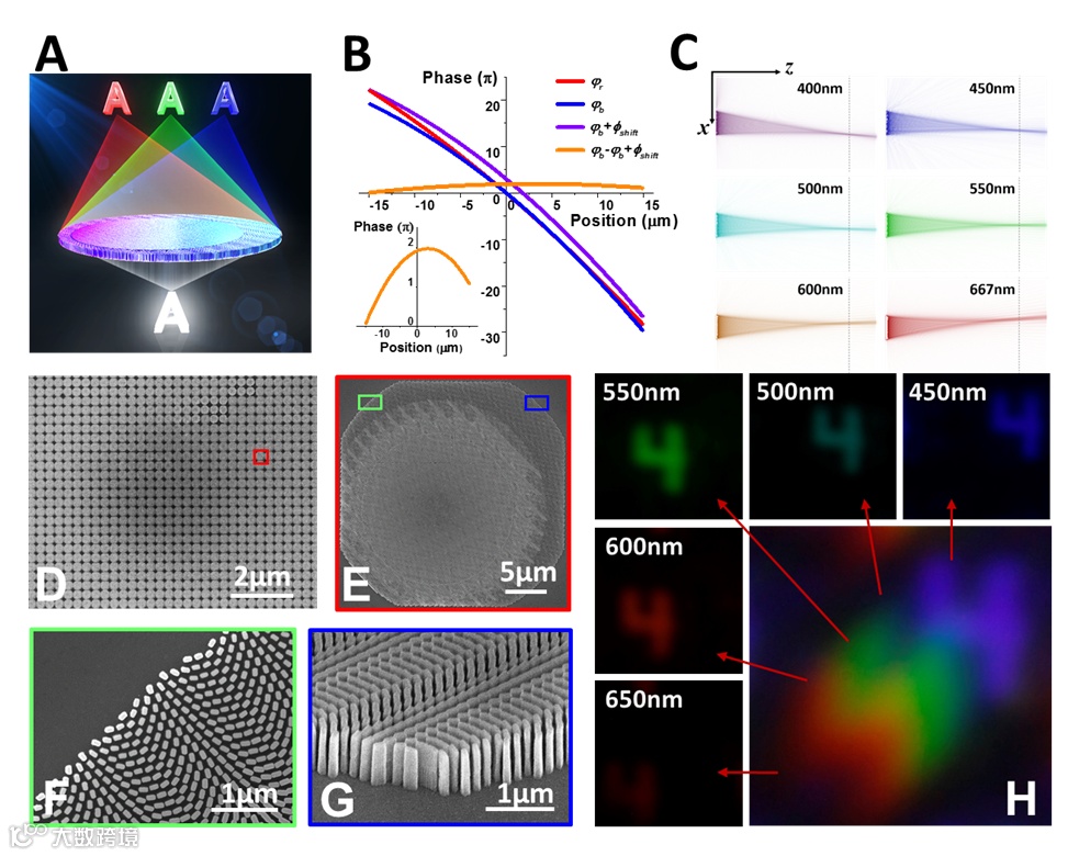 研究人员研制了48×48个TiO2超构透镜阵列,每个超构透镜的直径为30µm,包含了超过25,000个TiO2纳米柱和纳米孔,工作波段为400nm到667nm。值得一提的是,所设计的纳米柱和纳米孔要求具有近乎完美的垂直侧壁,且最大纵横比达到了40,这对于控制超构透镜阵列的有效折射率至关重要。联合团队克服困难,大幅提升了TiO2超构表面的加工工艺,最终完美的制备出了超构透镜阵列样品(样品的SEM照片如图1D-1G所示)。使用450至650nm窗口的白光照明,来自物体“4”的光线由超构透镜成像到传感器的不同位置,图像之间的明显偏移显示了不同波长光的横向色差(参见图1H)。