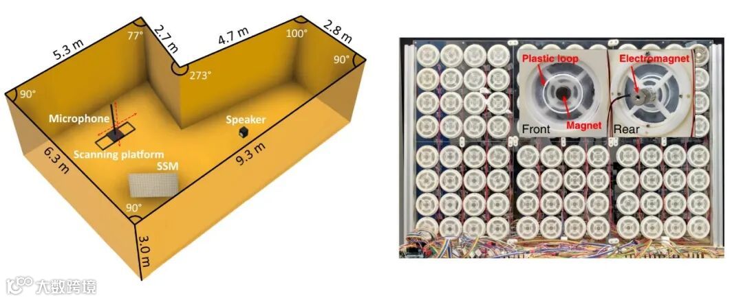 因此,在2018年研究团队参考电磁波领域中的空间光调制器(Spatial Light Modulator/SLM)和空间微波调制器(Spatial Microwave Modulator/SMM),提出并设计了一款空间声场调制器(Spatial Sound Modulator/SSM),用于实现对混响声场的有效调控。它是一种以薄膜型声学超材料为单元构成的可编程声波超表面,其中每个单元能通过电磁铁的操控在两种共振模式中转换,从而可以在其工作频段内对透射的声波附加一个相位差。通过每一个单元对透射声的相位调控,SSM能够影响整个房间的模态分布,从而对房间内其他位置的局域声场产生影响。这一过程可以与光学系统中的波前整形(Wavefront Shaping)类比。