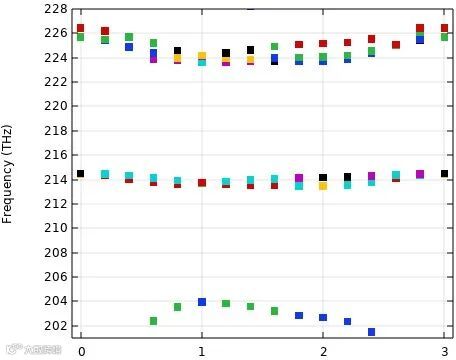 其本征频率的仿真则和一般光子晶体板的仿真方法完全相同。在215 THz附近我们可以得到两条近乎简并的准平带(原文Fig. 2f):