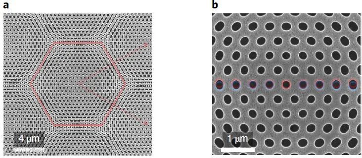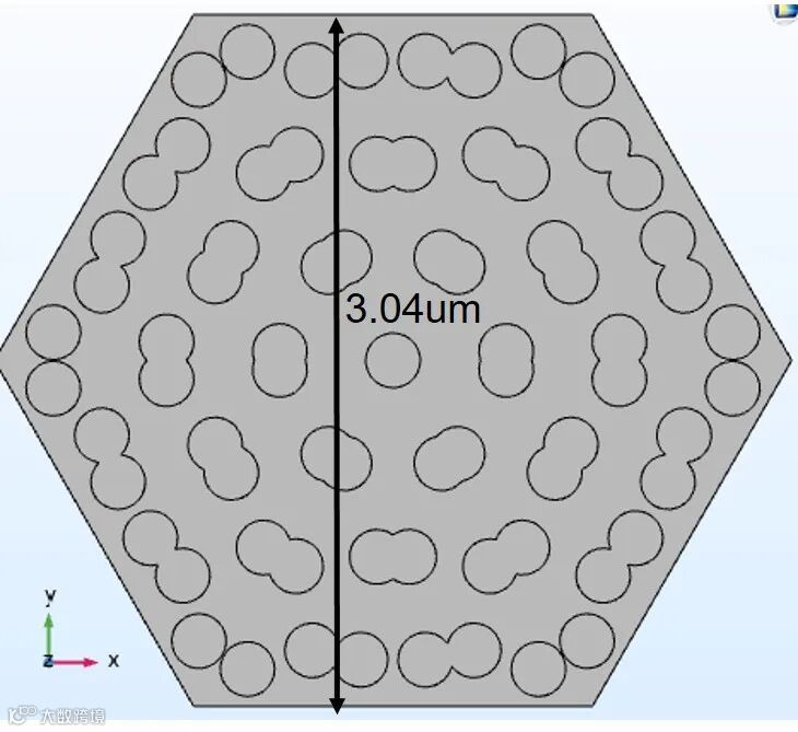 与电子系统中的魔角石墨烯不同,马老师的光学魔角则是在单层光子晶体板中设计了魔角的pattern,这个设计非常的巧妙,不仅大大降低了实验的难度,还能继续利用层间的模式耦合,从而实现具有非色散特性的谐振模(即对应超胞仿真的平带)。由于魔角越小,对应的超胞越大,为了提高仿真速度,模数哥这里用自己的小电脑为大家demon魔角为9.43°的COMSOL仿真结果,根据原文给的几何参数,此时的莫尔超胞的lattice constant为3.04um,其仿真模型的平面俯视图如下所示: