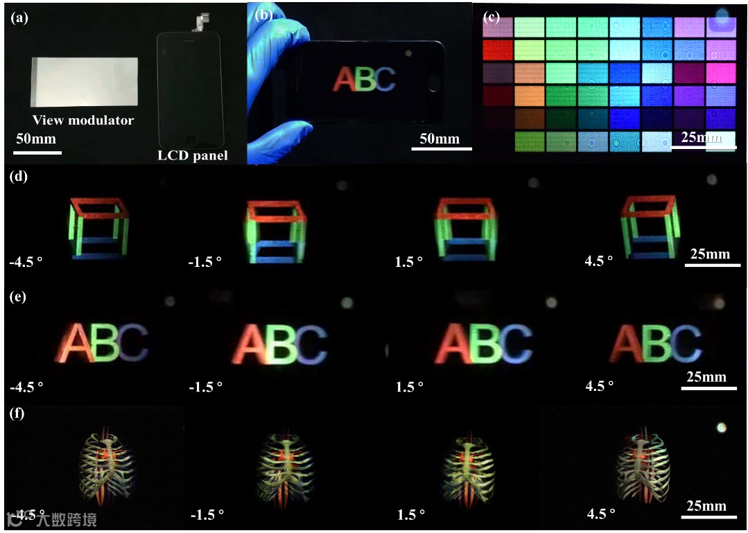 传统几何光学,其透镜受数值孔径和波长限制,焦深难以展宽。微纳光学的发展为研究人员研制超长焦深的薄膜透镜阵列提供了一种全新的设计思路。研究团队通过优化薄膜透镜的微结构分布,在获得高质量成像性能的前提下,扩展了薄膜透镜的焦深。创新性地基于超长焦深薄膜透镜阵列研制的向量光场3D显示屏,在准直光下形成会聚视点,实现了具有良好运动视差、高光效、大观看范围的全彩色3D显示。该研究成果在消费电子领域具有应用潜力,有望为消费者及厂商带来“3D模式盛宴”(图4)。