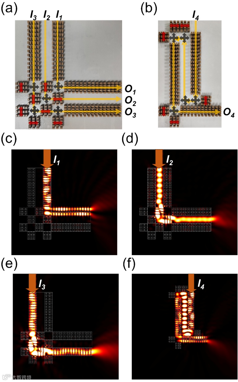 图 3:波导阵列直角转弯和无包层光回路。(a,b) 无包层直角转弯波导阵列和无包层光回路装置示意图。(c-f) 在输入端口Iᵢ(i=1,2,3,4)的独立激励下的仿真结果。