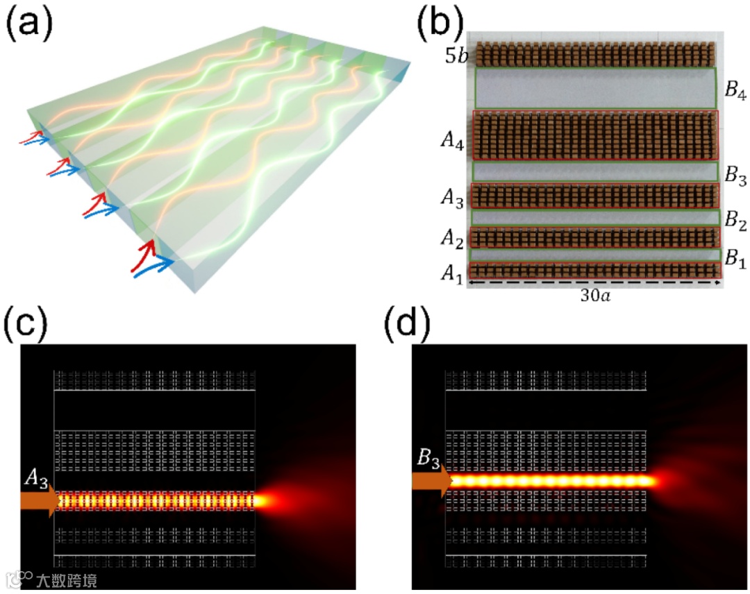 有了这种光子晶体波导,研究人员把它们与空气通道依次间隔排列,就可以形成一个无需包层的波导阵列,示意图如图 2(a)所示。图 2(b)是一个微波频段的无包层波导阵列的照片,它由 4 种不同厚度的光子晶体通道和空气通道构成,命名为A₁₋₄(超构材料波导),B₁₋₄(空气波导)。研究人员分别对每个端口分别激发微波,发现电磁波都被限制在相应的通道中。其中图 2(c、d)展示了A₃,B₃通道的结果。至此验证了无包层波导阵列的概念。