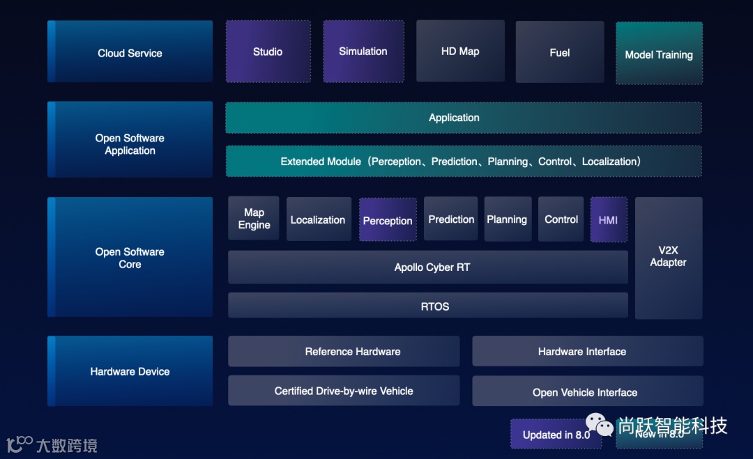 Apollo 8.0致力于为自动驾驶开发人员提供可扩展的软件框架和完整的开发周期。Apollo 8.0引入了易于重用的 “包” 来组织软件模块。Apollo 8.0通过结合模型训练服务,模型部署工具和端到端视觉验证工具,集成了感知开发的整个过程。另外3个新的深度学习模型被纳入Apollo 8.0的感知模块。通过在Dreamview中集成本地模拟器来升级仿真服务,为PnC开发人员提供强大的调试工具。建筑 硬件/车辆概述