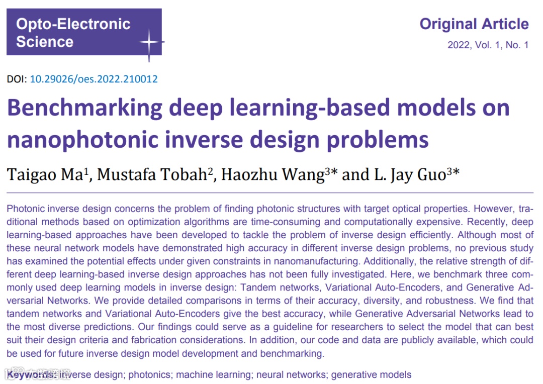 文章 | Ma TG, Tobah M, Wang HZ, Guo LJ. Benchmarking deep learning-based models on nanophotonic inverse design problems. Opto-Electron Sci 1, 210012 (2022).