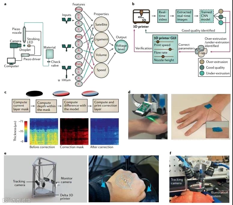 目前个性化的可穿戴设备大多是通过非原位打印制造的,该方法要先在平面基板上进行打印,随后再转移到目标表面上,但这种操作可能导致打印结构和目标表面无法在动态情况下实现匹配。原位打印为直接在目标表面上打印3D构造提供了一种潜在的解决方案,该方案需要人工智能(AI)的帮助来感知、适应和预测打印环境的状态。