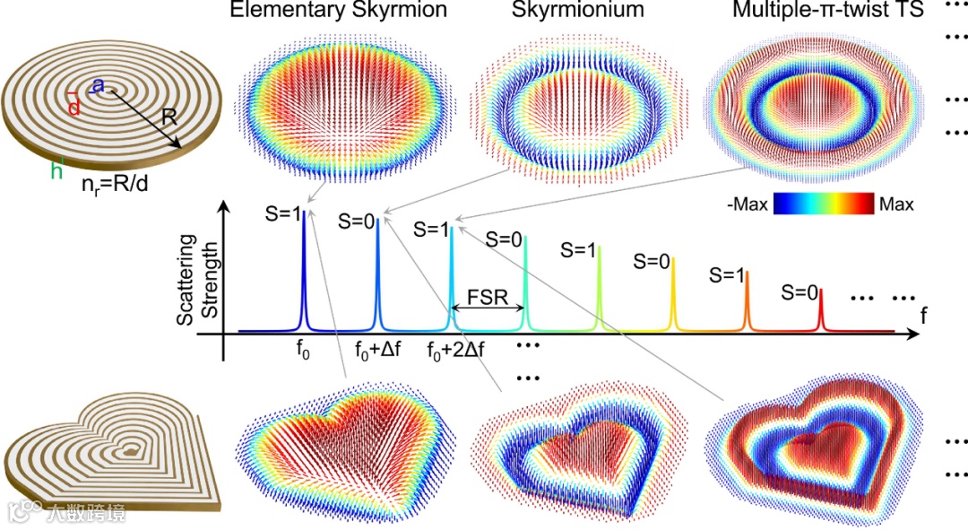 图 1. 任意形态局域表面等离激元斯格明子示意图。空间卷曲超构基元结构支持梳状响应频率的多阶局域表面等离激元磁本征模式,每个模式对应着不同阶次的Target斯格明子。其模式形态可以根据空间卷曲基元结构的形状按需设计(如这里的圆形与心形)。