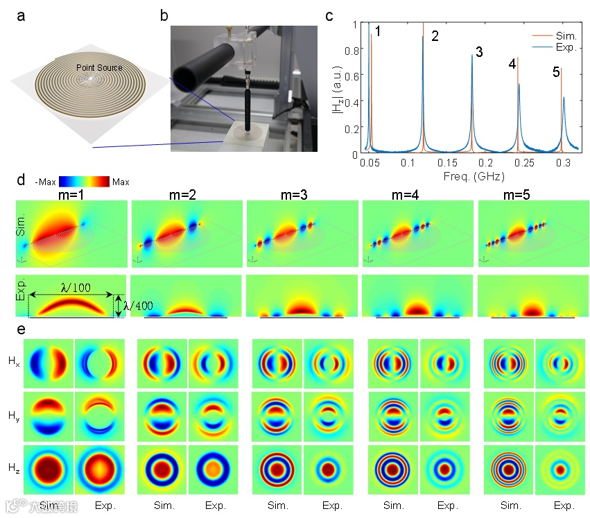 本研究工作采用如图1所示的空间卷曲金属线超构基元结构。该结构可等效为一个空间卷曲波导,在相同结构尺寸下,空间卷曲结构的等效波导长度越长,共振波长越长,从而能将电磁波模式局域在深度亚波长范围内。多阶模式的共振频率呈类似于回音壁模式的等距的梳状分布,但不同于回音壁模式模场节点呈纯角向分布的特点,此空间卷曲超构基元的模场节点呈纯径向分布,如图2所示。