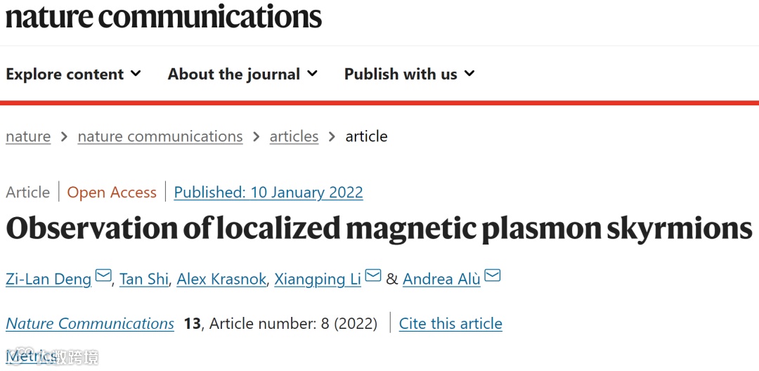 Zi-Lan Deng, Tan Shi, Alex Krasnok, Xiangping Li, and Andrea Alù, "Observation of localized magnetic plasmon skyrmions," Nat. Commun. 13(1), 8 (2022). DOI: 10.1038/s41467-021-27710-w