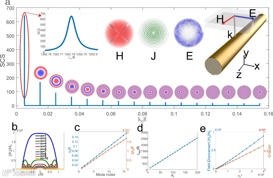 图2. 二维空间卷曲基元结构的共振散射特性。(a)二维空间卷曲基元结构的散射截面谱及模场分布。(b-e)模场分布截面图、共振频率、场增强系数随模式阶数、卷曲圈数(nr)的变化规律。