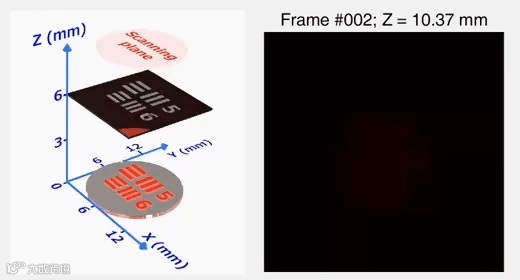 此外,该系统还具有高精度三维成像能力,利用超快光学符合门控技术,可以精确测量反射信号光子的相对飞行时间,从而得到被测物体表面的形貌信息。研究人员通过在银镜上叠加分辨率测试靶来模拟三维成像场景:测试靶铬涂覆层表面反射形成的阴文图案与透射光束被银镜反射的阳文图案将先后进入成像系统,通过扫描泵浦脉冲的时间延迟即可精确分辨两个图案的相对位置(图5)。成像系统的纵向分辨精度取决于双色超短脉冲脉宽,若进一步压缩双色脉冲脉宽至百飞秒水平,三维扫描精度有望达到微米量级。