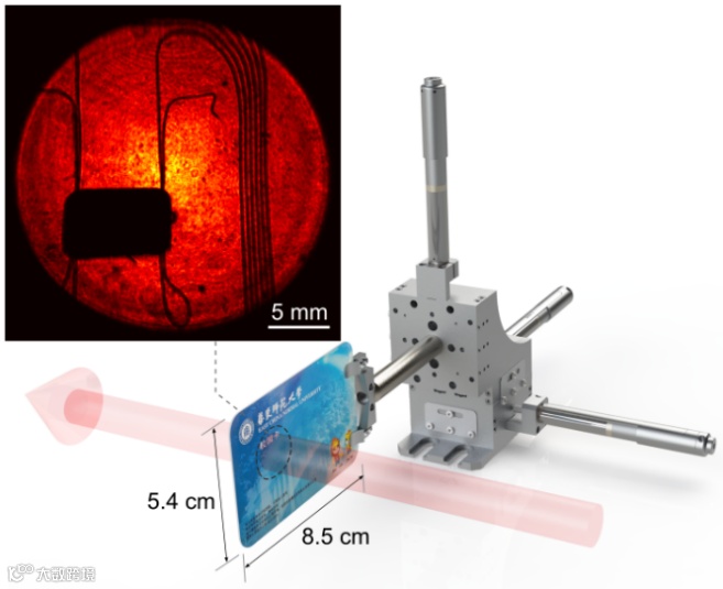 同时,该团队结合同步脉冲泵浦技术与窄带高效滤波技术有效压制了背景噪声,获得了1光子/脉冲极低照度下单光子水平的中红外大视场成像。结合宽视场与高灵敏特性,研究人员进一步利用该中红外成像系统实现了校园卡内部结构的实时扫描检测,清晰识别了卡片内嵌芯片与金属线圈(图3)。该成像技术有望应用于半导体芯片检测、材料无损探伤等领域。