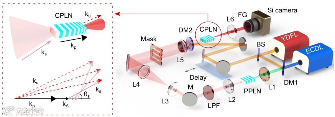 中红外光子成像广泛应用于分子光谱学、空间天文学等基础研究,以及红外遥感、环境监测、疾病诊断等应用领域中。当前,成熟的中红外相机主要基于碲镉汞、锑化铟等窄带半导体材料,通常需要采用低温制冷提升探测灵敏度。发展能够室温工作的中红外超灵敏成像一直以来都是国际研究的热点。近年来,红外上转换探测技术备受关注,其通过非线性过程将红外光场转换至高性能硅基探测器件能够响应的波段,为高效低噪的红外单光子测控提供了有效途径。然而,受严格相位匹配限制,现存上转换成像方案面临着探测带宽窄、视场角受限等亟待解决的难题,往往依赖参数调谐或机械扫描等方式,需要后期拼接配准图像空间信息,致使图像采集耗时长,后处理过程复杂,极大限制了上转换成像技术的应用场景。
