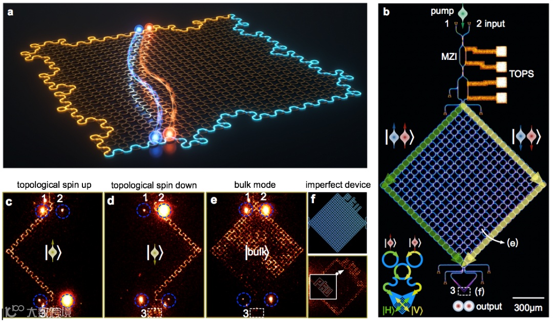 图1 (a)带缺陷的拓扑保护纠缠光源示意图;(b) 拓扑量子纠缠光源显微镜实物图;(c,d) 上下赝自旋的拓扑边界态成像图;(e)体态成像图;(f)北京大学“PKU”形状缺陷器件及其边界态成像图