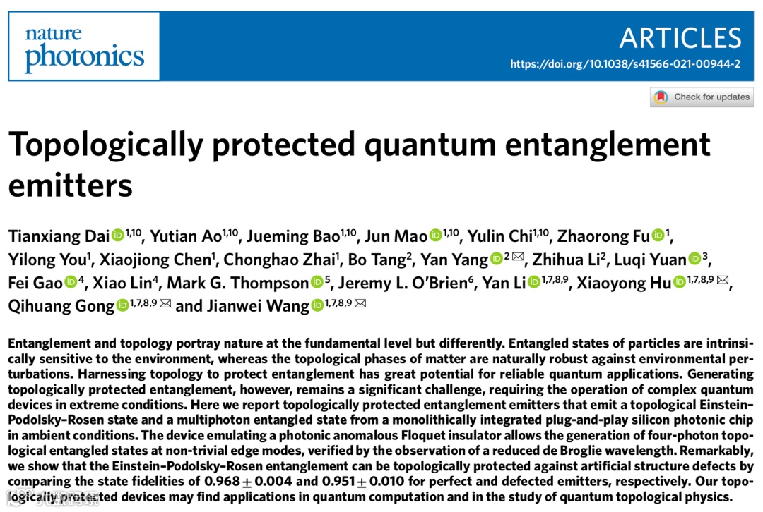 2022年2月17日,相关成果以“拓扑保护的量子纠缠光源”(Topologically Protected Quantum Entanglement Emitters)为题,在线发表于《自然·光子学》(Nature Photonics)。北京大学物理学院2019级博士研究生戴天祥、2017级博士研究生敖雨田、2018级博士研究生包觉明、2020级博士研究生茆峻、2019级博士研究生池昱霖为文章共同第一作者,王剑威、胡小永、龚旗煌与中国科学院微电子研究所杨妍研究员为共同通讯作者;主要合作者还包括中国科学院微电子研究所李志华研究员、唐波研究员,上海交通大学袁璐琦教授,浙江大学高飞教授、林晓教授,英国布里斯托尔大学Mark Thompson教授,澳大利亚西澳大学Jeremy O’Brien教授,北京大学物理学院李焱教授,以及北京大学物理学院本科生傅兆瑢、尤一龙(现为2021级博士研究生),博士研究生陈晓炯、翟翀昊。