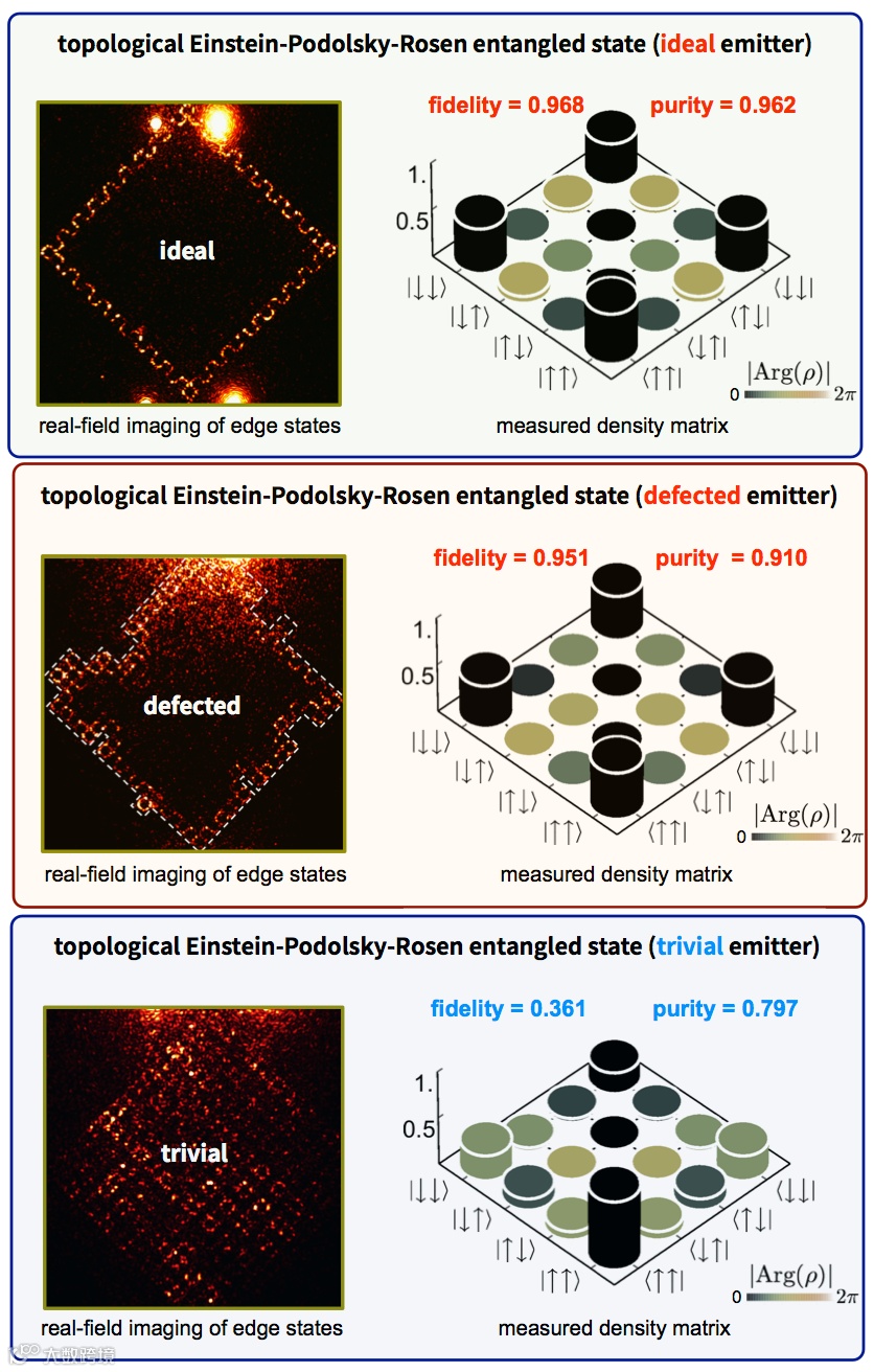 实验结果表明,该拓扑量子纠缠光源产生的EPR纠缠态,具有96.8%的高保真度和96.2%的高纯度(图2上)。重要的是,即使在纠缠源内部存在某些类结构缺陷和加工误差导致的无序,拓扑鲁棒性仍可免疫该类缺陷和无序,从而高质量地保护量子纠缠态的性能,依然获得了具有和完美器件近乎一致的高量子态保真度和纯度(图2中)。相反,对于一个平凡量子器件而言,即便不存在结构缺陷,纠缠性能也会因为器件加工误差导致的无序性而被破坏(图2下)。具体实验结果及其对比,如图2所示。同时,联合研究团队在强脉冲激光泵浦的实验条件下,通过观察多光子量子干涉的德布罗意波长,还展示了该器件还可用于产生拓扑保护的四光子数纠缠态。