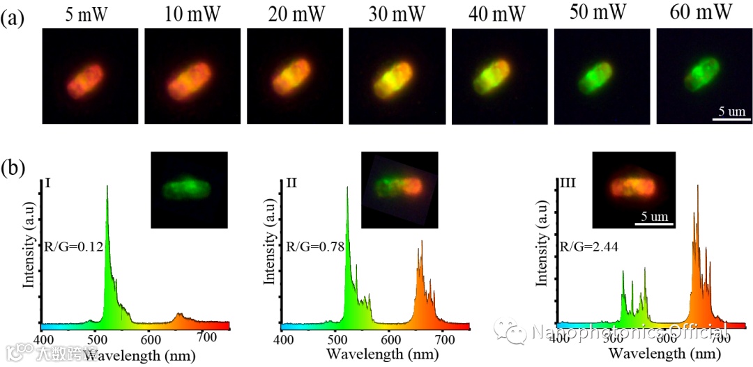 此外,基于等离激元微纳热源可控温度的特性,团队进一步研究了Er3+掺杂的上转微米颗粒温度依赖荧光发射特性。从实验结果中可以看出,被等离激元微纳热源包覆的微米颗粒可实现在不同温度下荧光发射颜色从红到黄、到绿光的调节。有趣的是,也可以通过改变激发位置,利用空间中较大的温度梯度,在同一个微米颗粒上实现了多种荧光颜色输出,如图3所示。