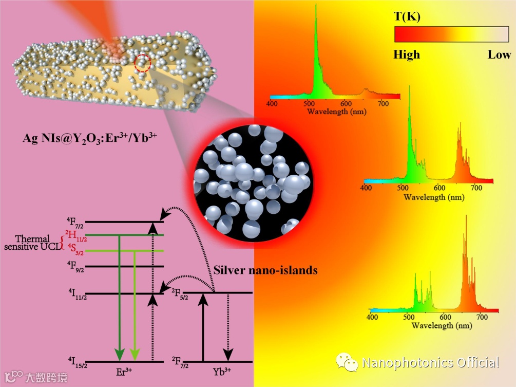 针对这些问题,近日陕西师范大学郑海荣教授团队在Nanophotonics发表最新文章,设计了一种基于银岛膜结构等离激元光热效应的微纳米热源,通过外加光场,在极短时间内获得了超过一千四百开尔文的局域高温。并进一步利用热稳定性较高的Er3+/Yb3+掺杂的Y2O3微纳材料进行了温度的实时测量,为微纳米尺度的温度控制和测量奠定了开辟了新思路