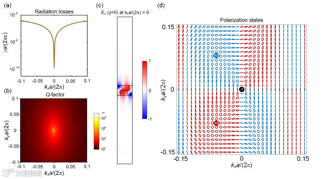 图3.(a)kx轴上的本征模式向上和向下辐射通道的损耗。(b)在动量空间中,具有不同面内波矢的本征模式的品质因子分布。(c)当相对位移δ为0.092a时,Γ点的本征模式的电场分布。(d)在动量空间中,具有不同面内波矢的本征模式向下辐射通道的极化态分布。