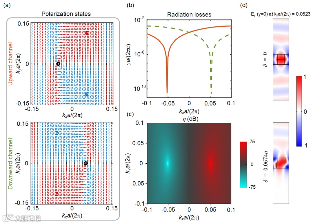 当δ为0.036a时,在动量空间中会出现两对C点。由于结构y方向的镜面对称性,这两对C点会对称地分布在kx轴两侧,具有相反的手性,且总拓扑荷数为0。此外,当相对位移δ为0.0674a时,两个拓扑荷数相同但是手性相反的C点会在正kx轴上合并为一个V点。由于V点的辐射为0,因此在该点上本征模式向下辐射通道的损耗为0,从而形成了一个仅向上单向辐射的模式。同时由于结构的空间反演对称,在负kx轴上则会存在一个仅向下单向辐射的模式。图2a展示了δ等于0.0674a时,具有不同面内波矢的本征模式向上和向下辐射通道的极化态在动量空间中的分布。图2b和2c则显示了kx轴上本征模式向上和向下辐射通道的损耗以及它们之间的比值。