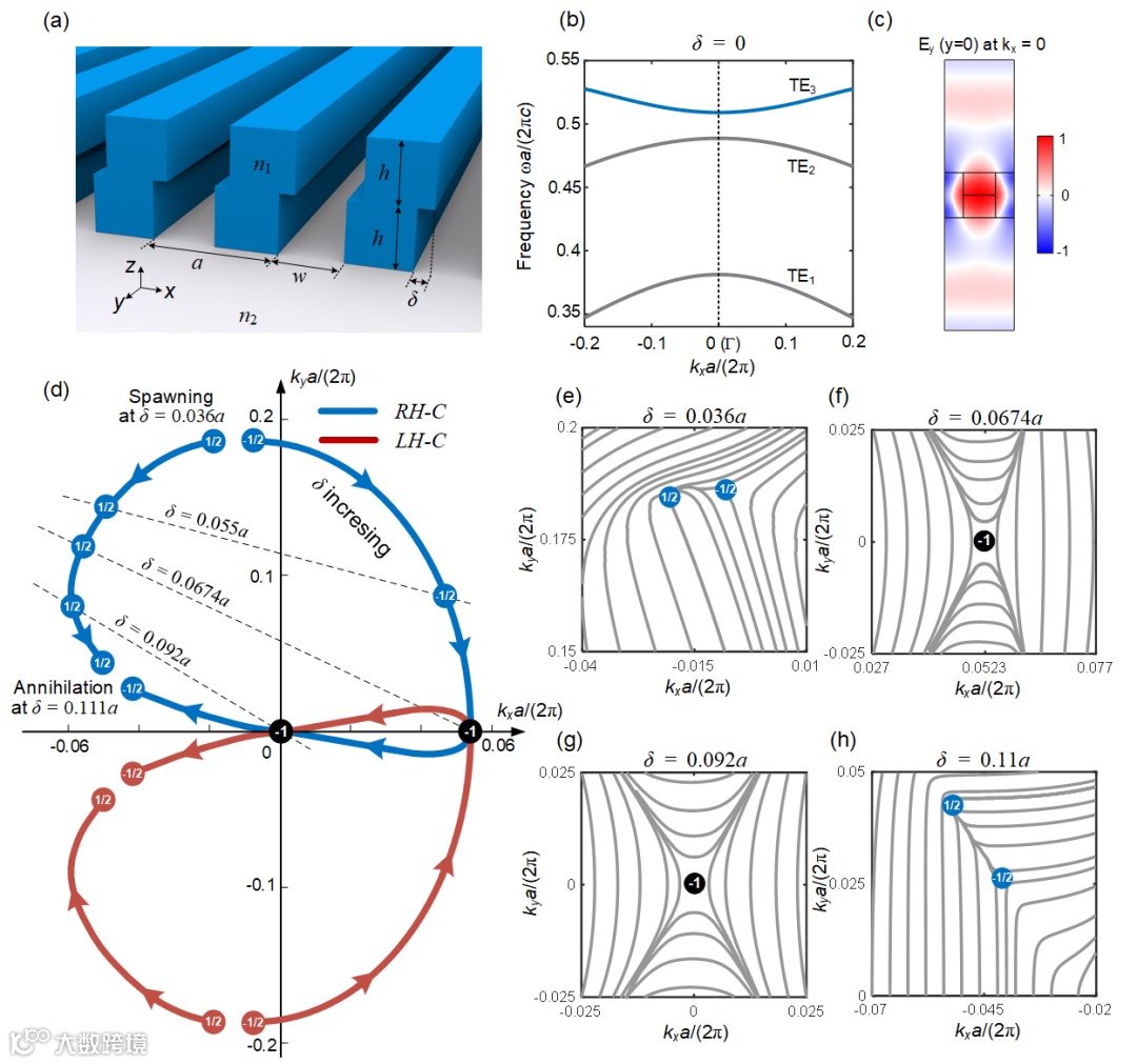 本文研究的光子晶体结构由上下堆叠的两个一维光栅组成,它们之间存在一个相对位移δ,如图1a所示。在相对位移δ为0时,该结构的能带结构如图1b所示。图1c展示了所研究的TE3能带在Γ点的电场分布。通过引入相对位移δ并变化δ的大小,可以观察到动量空间中两对C点完整的演化过程,包括产生,合并,与湮灭。在这个过程中,由于相对位移δ破坏了结构z方向的镜面对称性但保留了空间反演对称性,因此本征Bloch模式向上辐射通道的极化场分布与向下辐射通道的极化场分布在动量空间中相对于Γ点具有中心对称关系。图1d显示了对于不同的相对位移δ,本征模式向下辐射通道的极化奇点的演化轨迹。图1e-1h则为相应的动量空间中的极化场图。