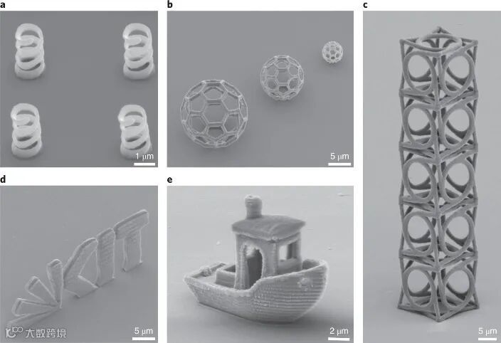 通过调整合适的化学组分和加工条件,光化学两步吸收的方法可以形成特征尺寸低于200 nm的 3D 木堆和其他复杂的 3D 结构(图4)。在可见光波长下,仅使用简单的低功率激光器和新的聚合物化学组分,就可以形成复杂的纳米结构,这将极大加速超材料、光子晶体和纳米结构组织支架等应用领域的研究。